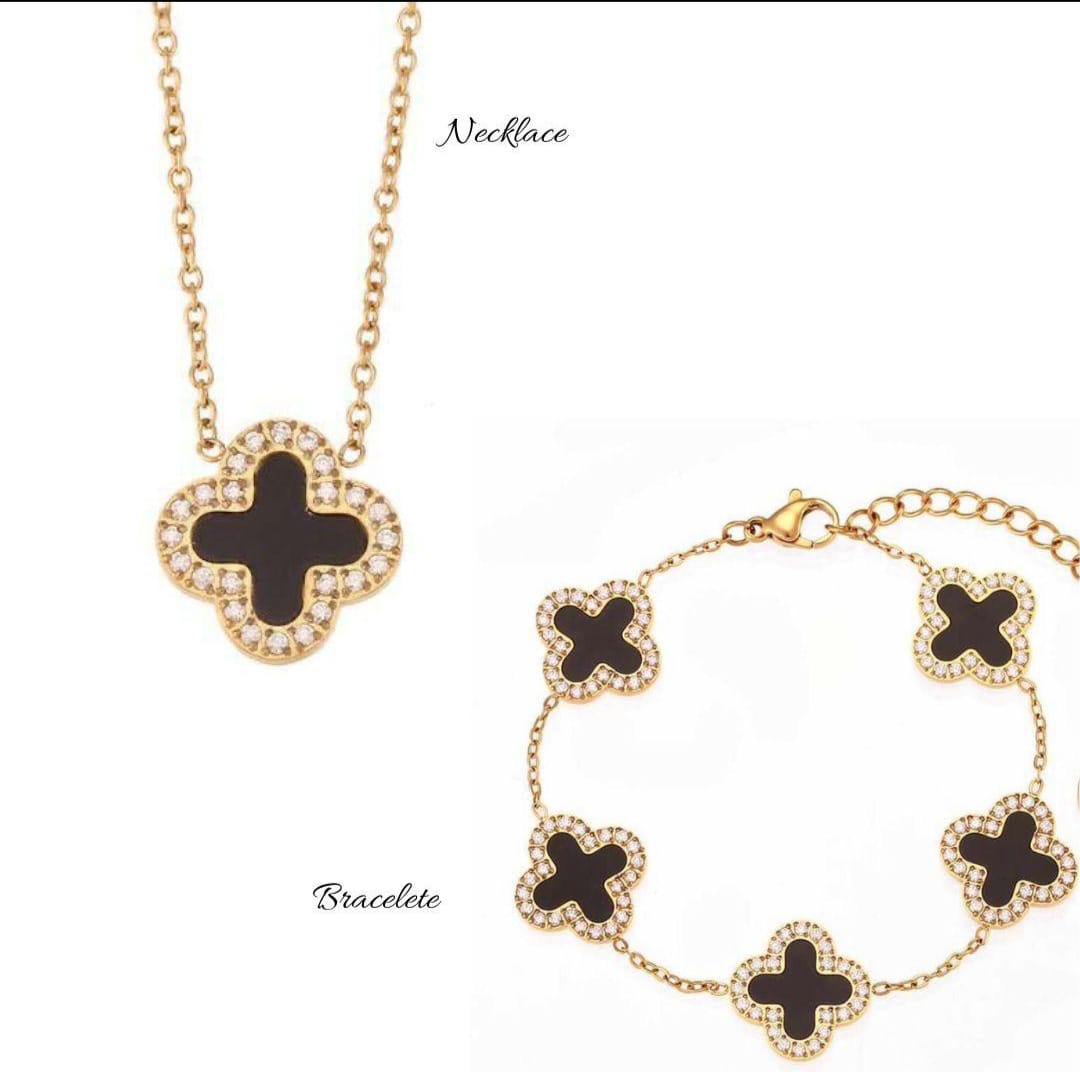 Elevate your style with this stunning black enamel clover set, featuring a sleek necklace and matching bracelet. Accented with sparkling crystals, this set strikes the perfect balance between luxury and modern elegance — ideal for day-to-night wear.
