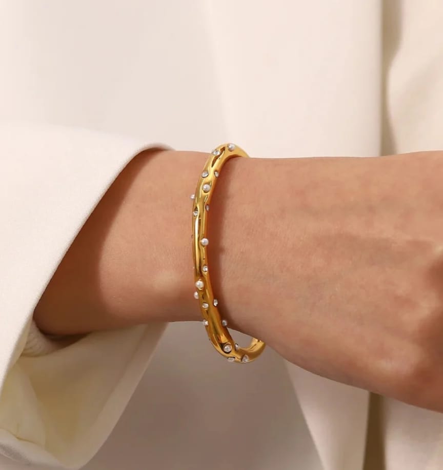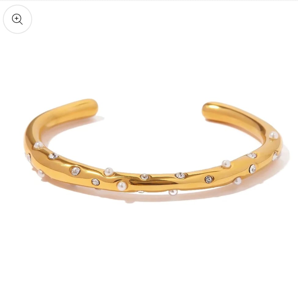 This sculpted gold cuff is delicately adorned with twinkling crystals and mini pearls — perfect for those who love their elegance with a little edge. šŸŒŸšŸ¤